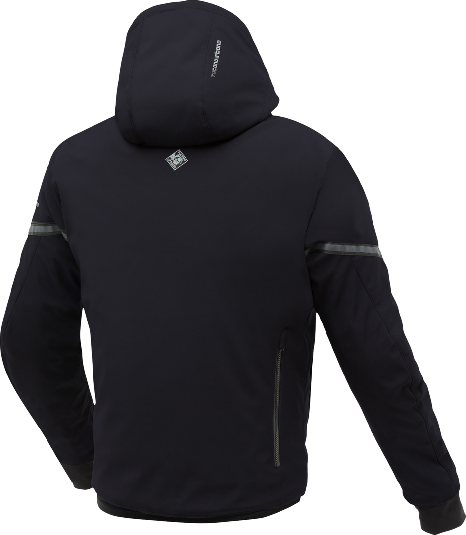 - Ergonomisch gepolsterte, abnehmbare Kapuze mit Windabweiser-Regulierung