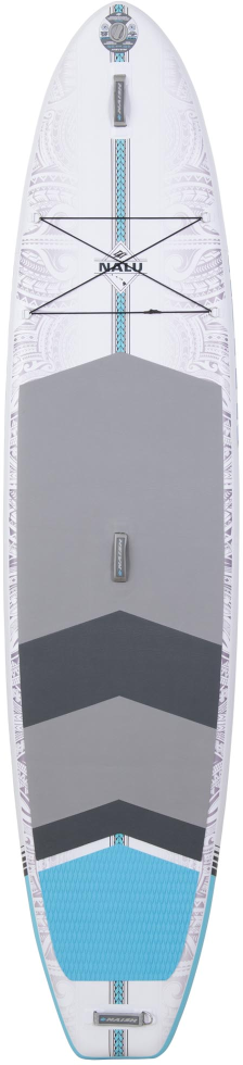 A great all-around choice for riders of all levels and sizes, the Nalu Inflatable Fusion boards were designed for all-around fun for the whole family, recreational touring, and longboard-style surfing in small waves. These boards offer stability and an incredible stiffnessto-weight ratio as a result of the high-pressure X-weave material. Fusion construction and 6” thickness further enhance stability for paddling performance similar to a composite board. With its lightweight construction and classic longboard outline, this board is fun to maneuver when cruising around or walking up to the nose on small waves. Ample room on the nose allows for kids to climb aboard, or to store some extra cargo with the cargo strap. The Nalu's pack a lightweight, stiff, and durable construction into a fun and easy-to-use shape, making SUPing enjoyable from the first stroke.
