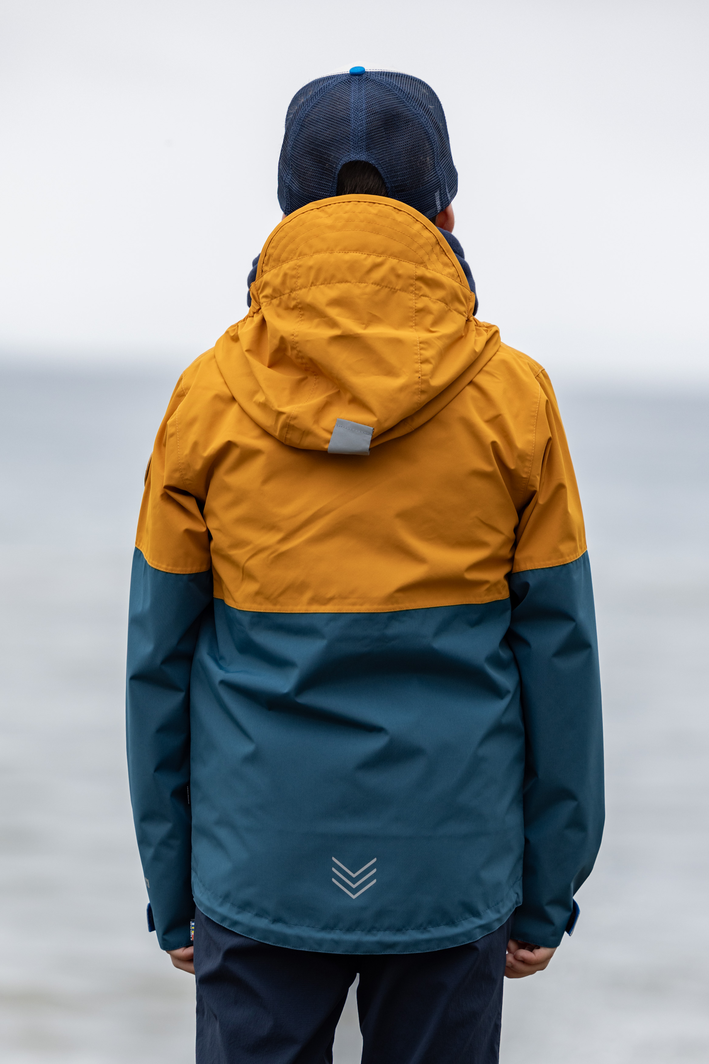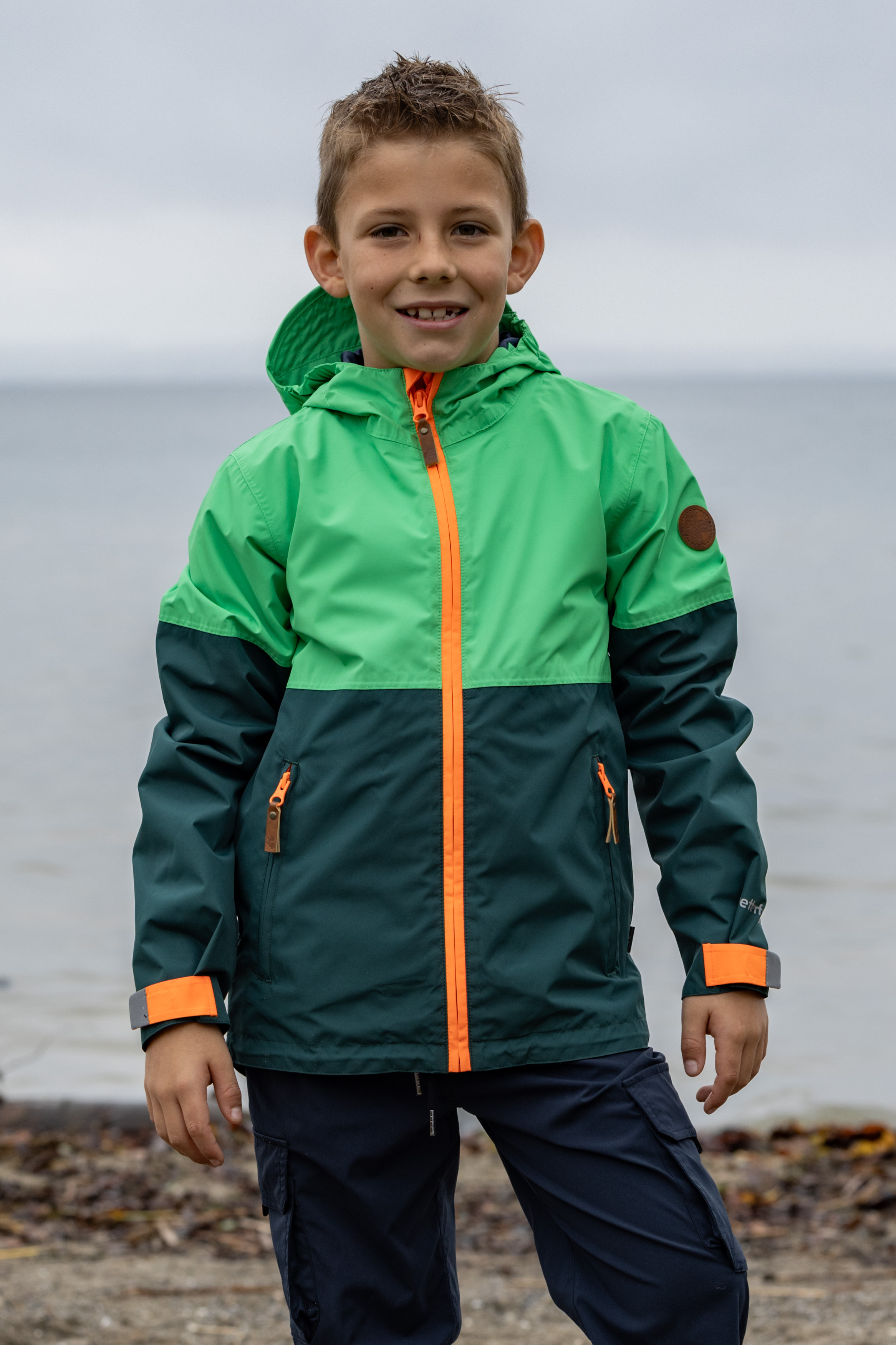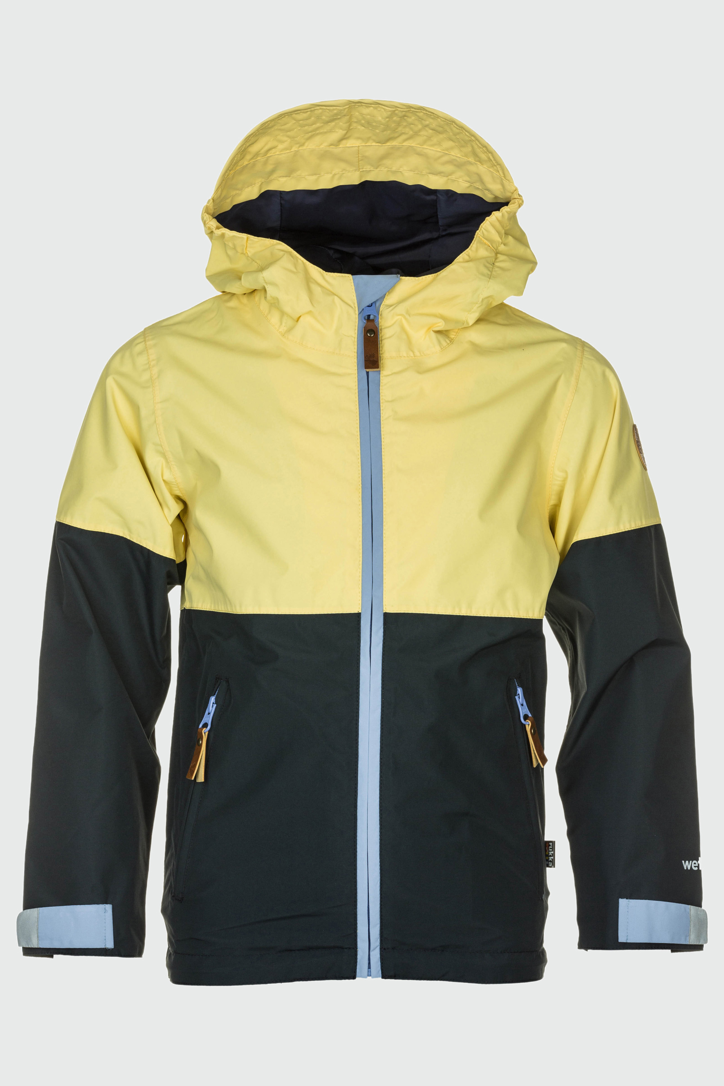 Puck. This colorful children's rain jacket always keeps your kids dry and of course the membrane also protects them from the wind. Two outside pockets and one inside pocket are just as practical as the fixed and adjustable hood.